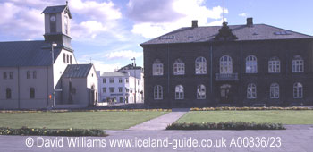 Dómkirkjan, the Lutheran cathedral and on the right is Althingishúsið,
