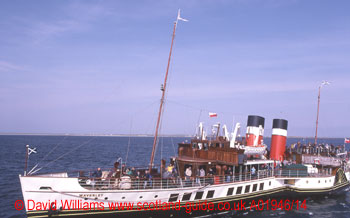 ready themselves for the return voyage. Once aboard, there is the usual searching for a seat. Many seek out seats high up in the upper decks, others look for more-sheltered spots; those in the know take into account the fact that on the return journey the previous-sheltered places may now become the exposed ones. Since eighty passengers have been on the Waverley for the past week, these are the hardy souls who are best-placed to know the most-favoured places to sit. Before departing the island there is a round of applause for the Tiree pier staff - a Waverley tradition. Once clear of the pier and with the sun high in the sky and shining brightly, everyone settles down for a leisurely cruise homeward. We keep looking out for minke whales but the largest animals we see on this part of the journey are cormorants, sometimes a group of them flying together in close formation only a few centimetres avove the calm surface of the sea. The Waverley